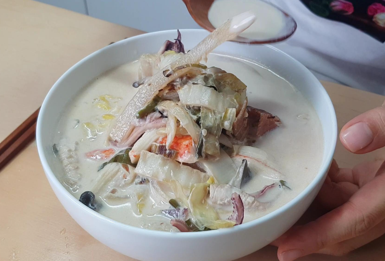 3. 참고로 야채를 볶는 동안 면도 미리 삶아 건져놔 주시는게 좋아요. 정호영 셰프 레시피에서는 라면 면을 썻는데 중화면이라도 상관없을 것 같아요. 살짝 꼬들하게 삶아 견져낸 면은 그릇에 담아놔 주세요. 그다음 야채를 볶은 팬에서 끓인 우유를 넣은 뒤 야채 맛이 국물에 우러나올 만큼 끓여주세요. 대략 5분 가량 끓여주면 되는데, 불끄기 1분전에 게맛살을 찢어서 넣어주세요. 살짝 데치듯이만 익히면 되거든요. 국밥 토렴하는 정도요.