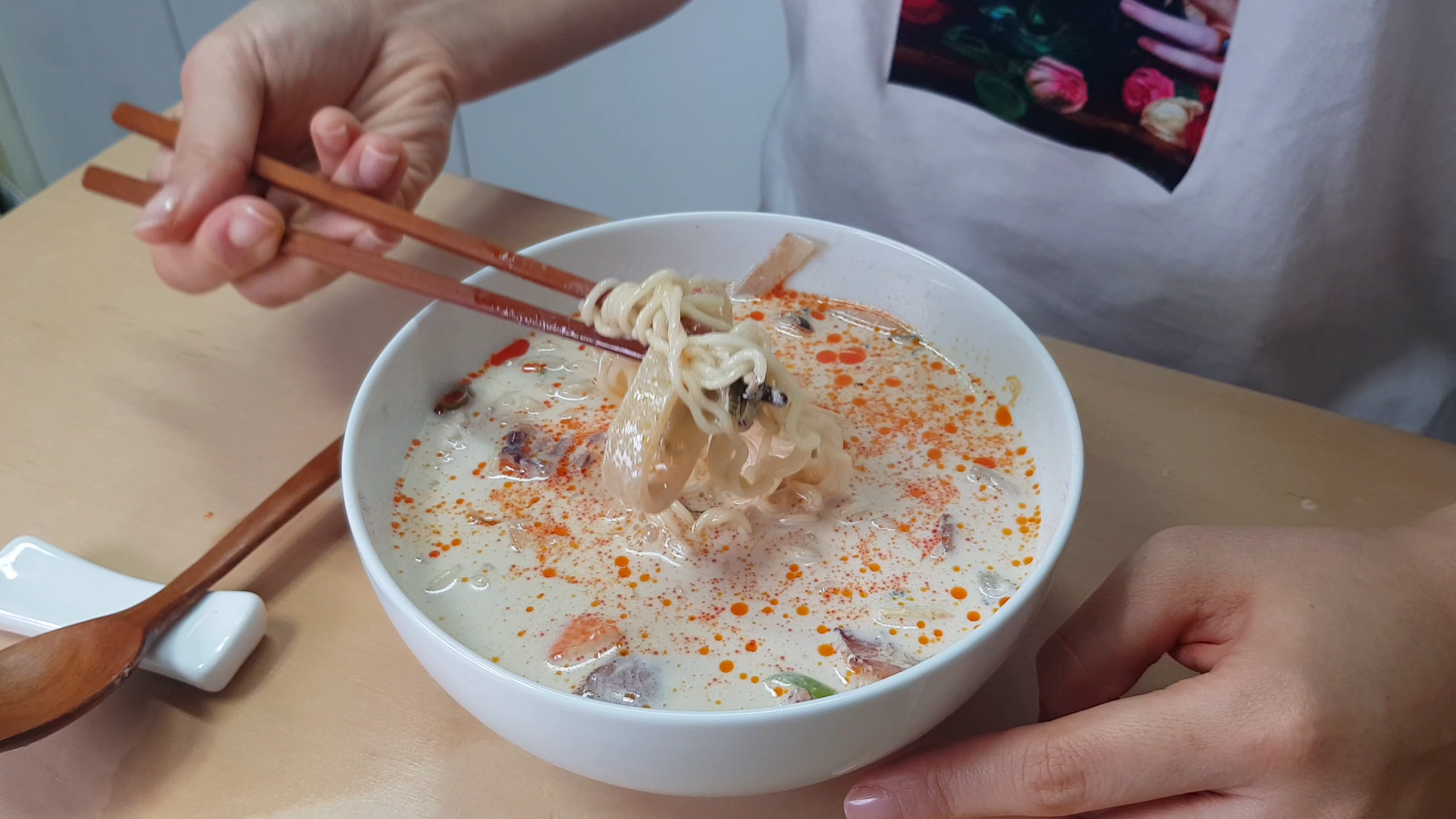 5. 조금더 짬뽕맛을 느끼고 싶다면 고추기름을 넣어주는것도 좋아요. 정호영 셰프의 킥이라고 소개되었는데요. 넣는 순간 빨간 짬뽕의 불향 같은게 느껴지더라구요. 오늘은 아침부터 건강하고 담백한 짬뽕 한 그릇을 완뽕하였습니다.